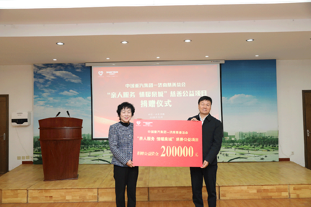 本次慈善公益项目不仅让“亲人服务”蕴含的国企担当精准落地,更依托“善润泉城”的专业力量提升帮扶效能,确保每一份善举更有温度、更具实效。仪式现场,中国重汽集团与济南慈善总会签订捐赠协议并进行公益资金交接,济南慈善总会向中国重汽集团颁发慈善捐赠证书。