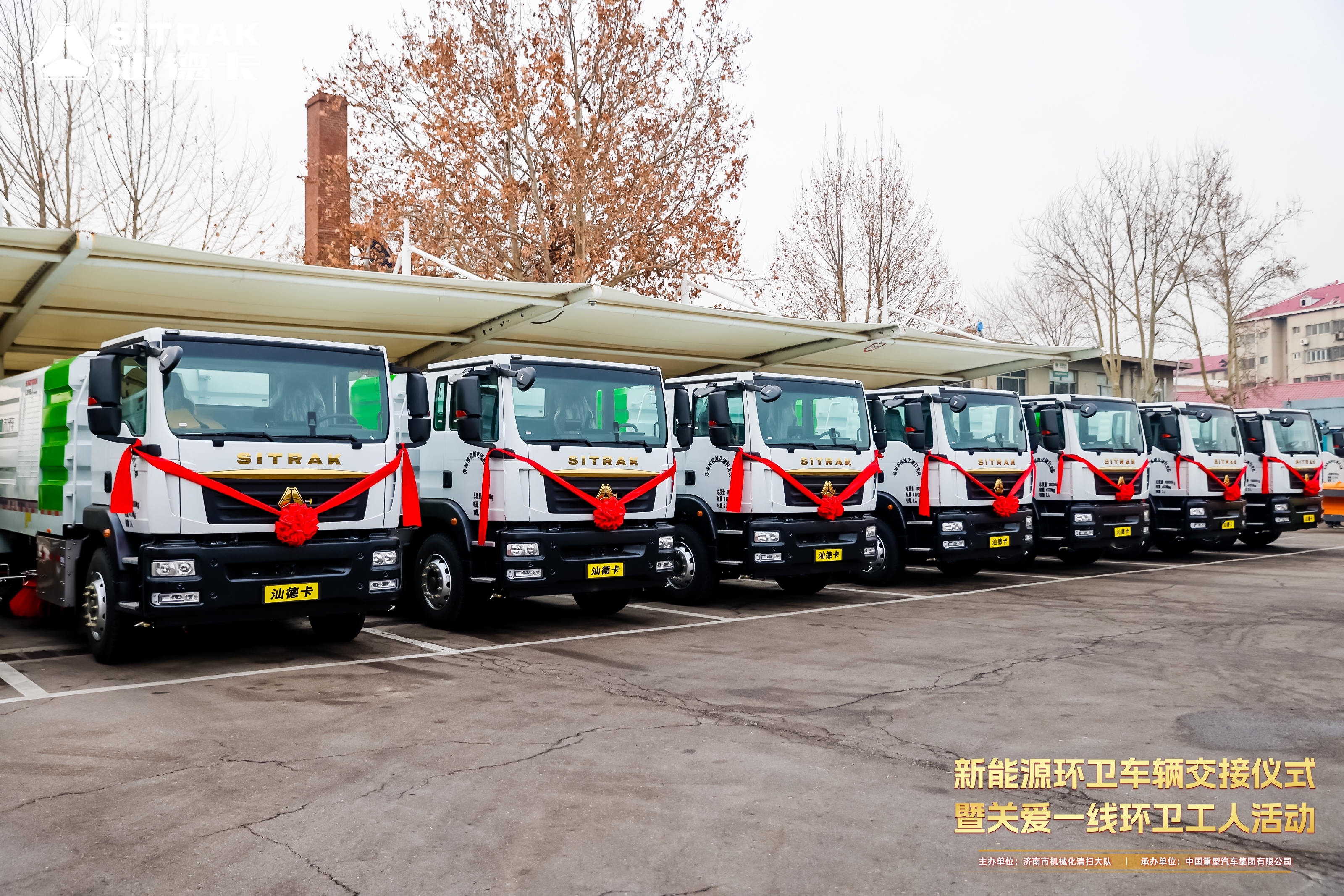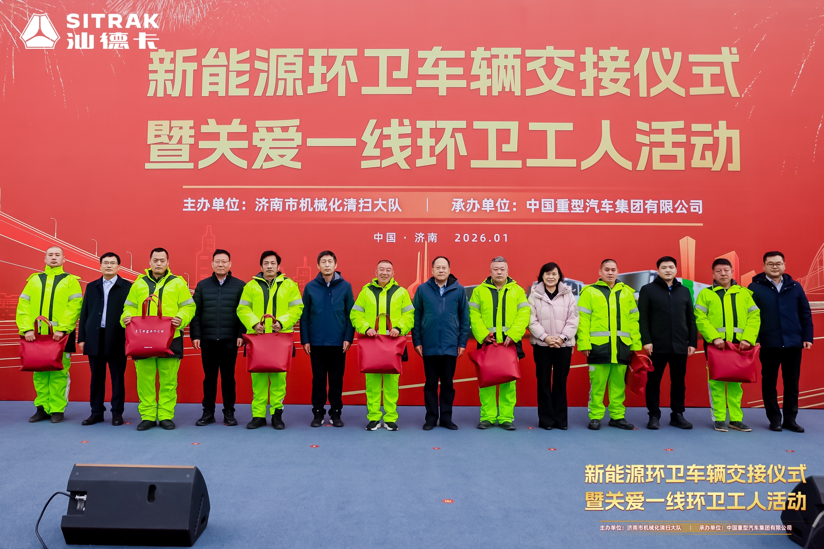 2026年1月14日,“新能源环卫车辆交接仪式暨关爱一线环卫工人活动”在济南机械化清扫大队隆重举行。活动以“绿色转型赋能环卫升级,温情关怀致敬一线匠人”为核心,同步开展37辆中国重汽汕德卡新能源环卫车批量交付与一线环卫工人关爱行动,政企携手开启济南环卫事业绿色转型新篇章。